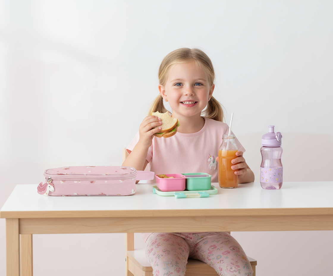 A bolsa térmica Magical Unicorn combina encanto e funcionalidade num rosa suave com delicados unicórnios. O interior isolado ajuda a manter a temperatura de iogurtes, fruta ou sandes por mais tempo, enquanto o exterior é leve, resistente e repelente de água. Fecha com fecho de correr de abertura suave e traz pega lateral para transportar ou pendurar. Limpeza prática: basta passar um pano húmido; também pode ir à máquina a 30º.