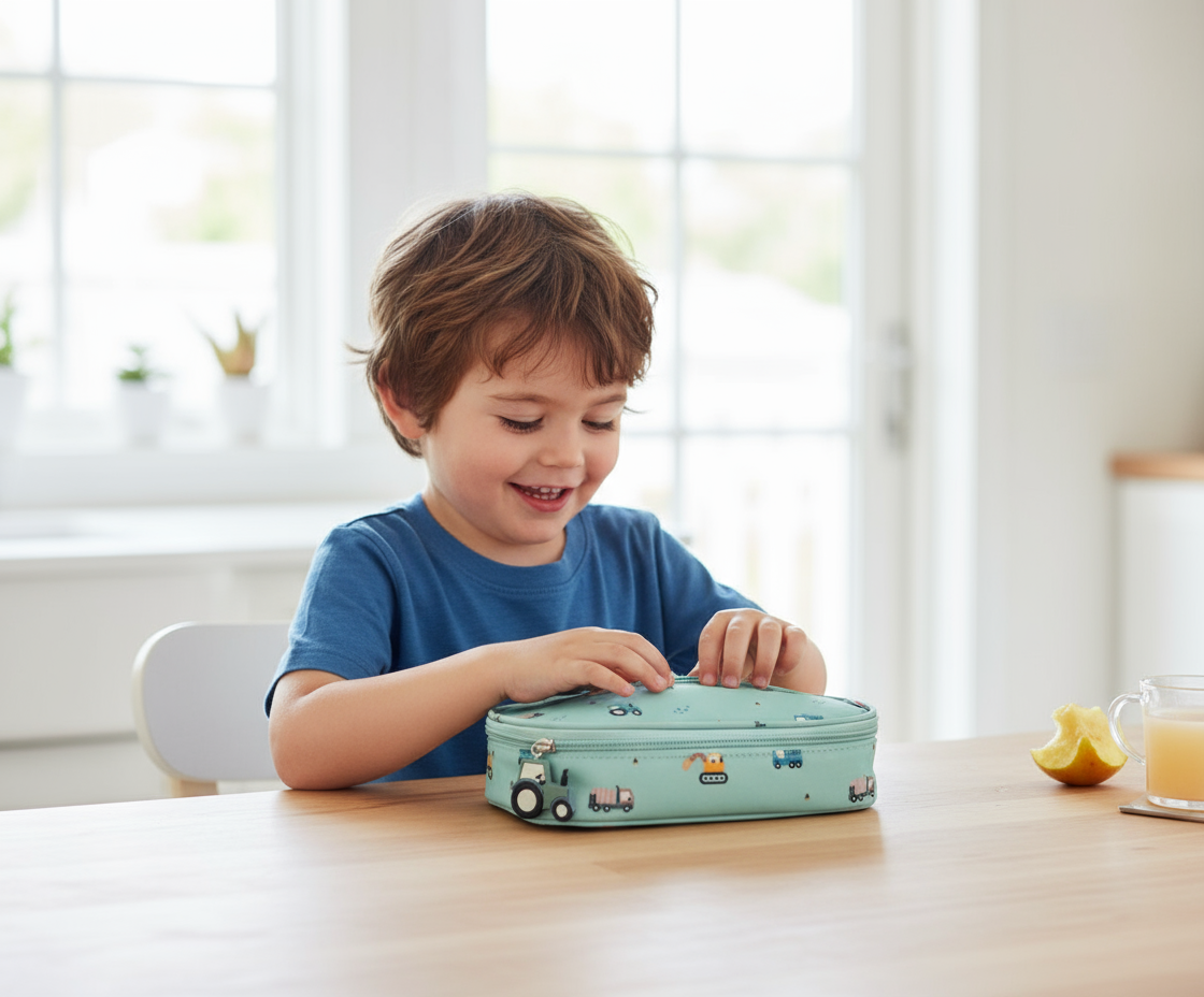 Com exterior em tecido resistente e interior térmico isolante, esta bolsa mantém o lanche fresco por mais tempo. O divertido padrão trucks alegra as manhãs, enquanto o fecho de correr com cursor temático e a asa lateral garantem praticidade na ida para a escola ou nos passeios. Estrutura leve, fácil de limpar e com formato plano que cabe na mochila sem ocupar espaço — um aliado simples, higiénico e cheio de estilo.