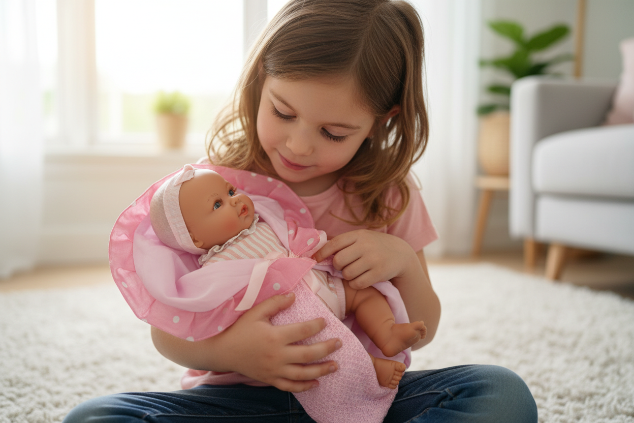 A Boneca Nana Chorona Rosa foi criada para despertar ternura e carinho nos pequenos gestos do dia a dia. Com 38 cm, tem um tamanho perfeito para abraçar, levar ao colo e adormecer em passeios tranquilos. O conjunto em tons de rosa, com capuz suave e detalhes delicados, envolve a boneca numa sensação de aconchego imediato. Ideal para estimular o faz-de-conta, a empatia e o cuidado, torna-se rapidamente numa companheira especial. Boneca com 38 cm, com acessórios têxteis em rosa (capuz/manta). Formato confortável para crianças, fácil de segurar e transportar. Ideal para brincadeiras de cuidados e rotinas de “nana”, em casa ou fora.