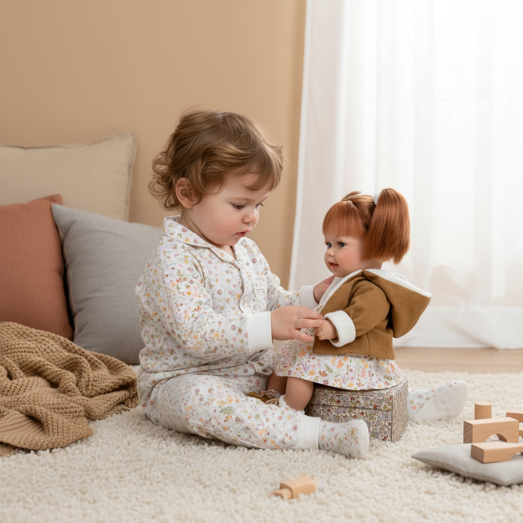 A Little Susi é uma menina muito simpática com cabelo ruivo fininho e cheiroso! Vem vestida com um vestido florido muito bonito e um casaco a combinar com as suas botas, criando um visual encantador e completo.