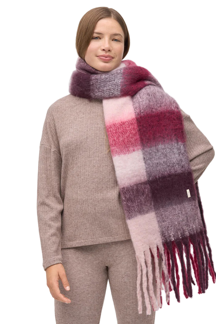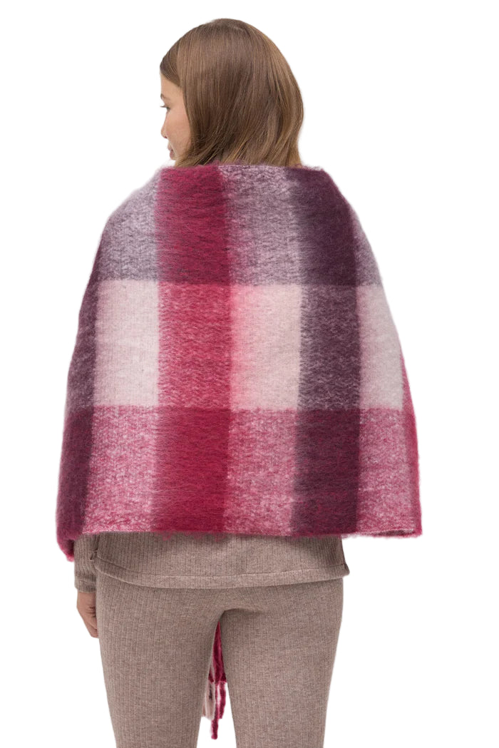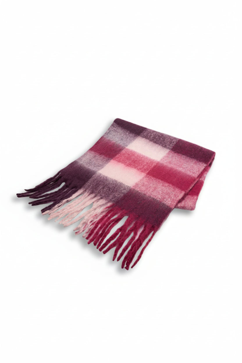 Em malha suave e leve, com efeito escovado que lembra lã, este cachecol envolve o pescoço num aconchego macio. O padrão xadrez esfumado mistura bordeaux, rosa talco e notas de ameixa e cinza, criando um degradé profundo e elegante. As franjas longas acrescentam movimento e um charme artesanal, enquanto a textura fofa assegura conforto sem pesar. Um acessório versátil que ilumina coordenados neutros e eleva o guarda-roupa de inverno.