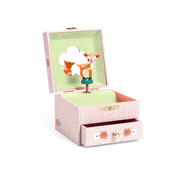 Tão delicada quanto encantadora, esta caixa de música e jóias revela um pequeno veado que gira com suavidade ao som de uma melodia tranquila, criando um momento mágico sempre que se abre a tampa. O interior macio protege anéis, pulseiras e pequenas lembranças, enquanto o espelho acrescenta brilho e fantasia ao ritual de arrumar. Com acabamento cuidado e um design poético, é um presente intemporal que transforma a rotina num gesto de ternura. Caixa de jóias musical com compartimento principal e gaveta inferior para melhor organização. Inclui espelho no interior e fecho seguro. Ideal para bijuteria, elásticos e pequenos tesouros do dia a dia.