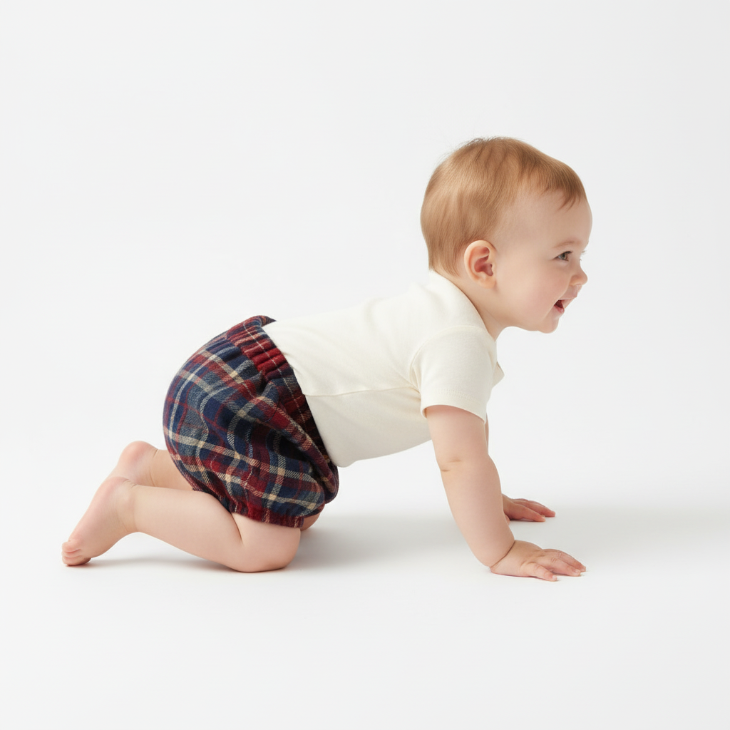 Em algodão macio com padrão tartan vermelho, azul-marinho e cru, estes calções balão envolvem a criança com leveza e conforto. A cintura totalmente elástica adapta-se sem apertos, enquanto as perneiras franzidas criam o volume encantador. Os botõezinhos decorativos na frente rematam o estilo tradicional. Tecido respirável, toque gentil para peles sensíveis, e confeção cuidada para acompanhar cada movimento com graça.