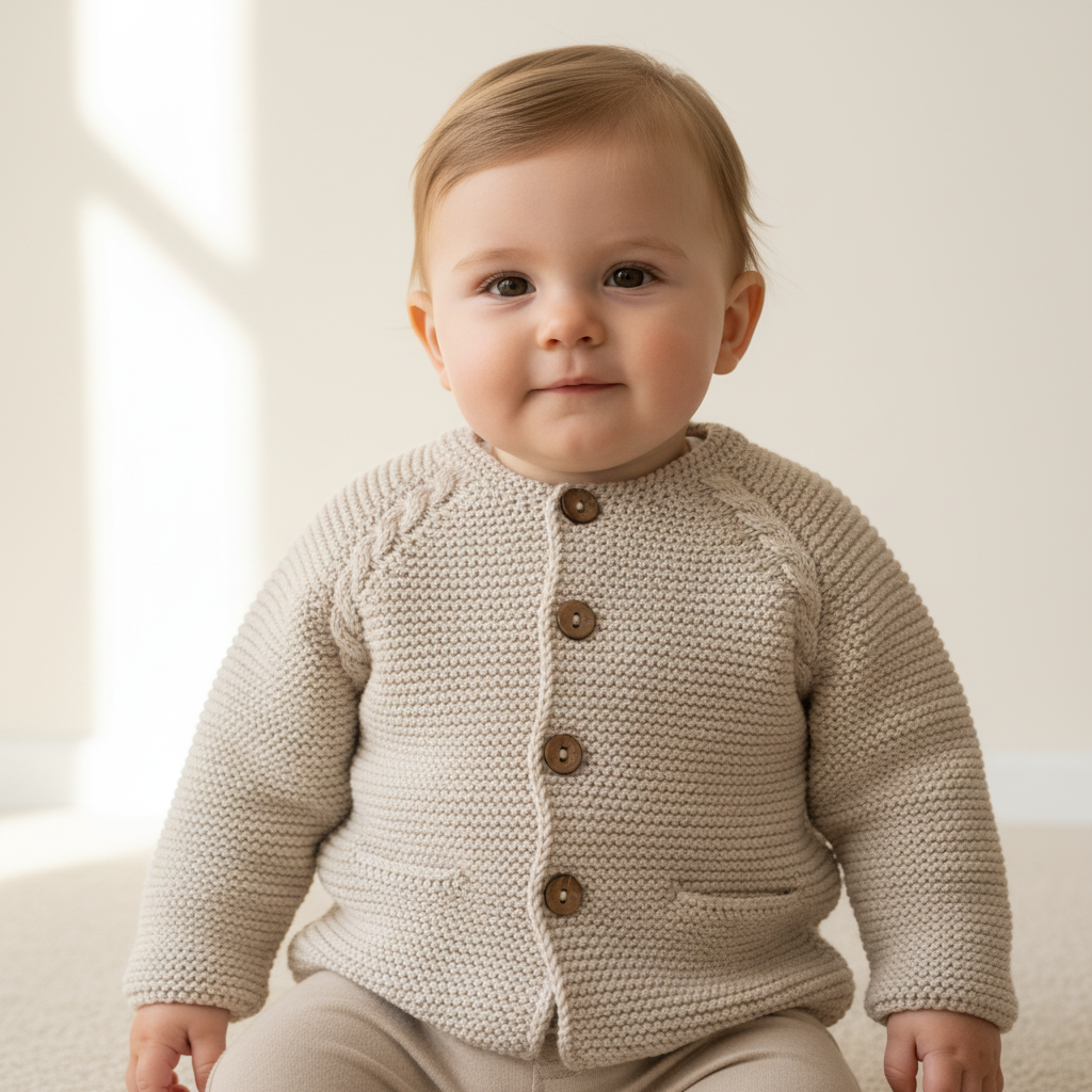Um casaco delicado que envolve a infância em conforto e guarda os primeiros momentos com ternura.