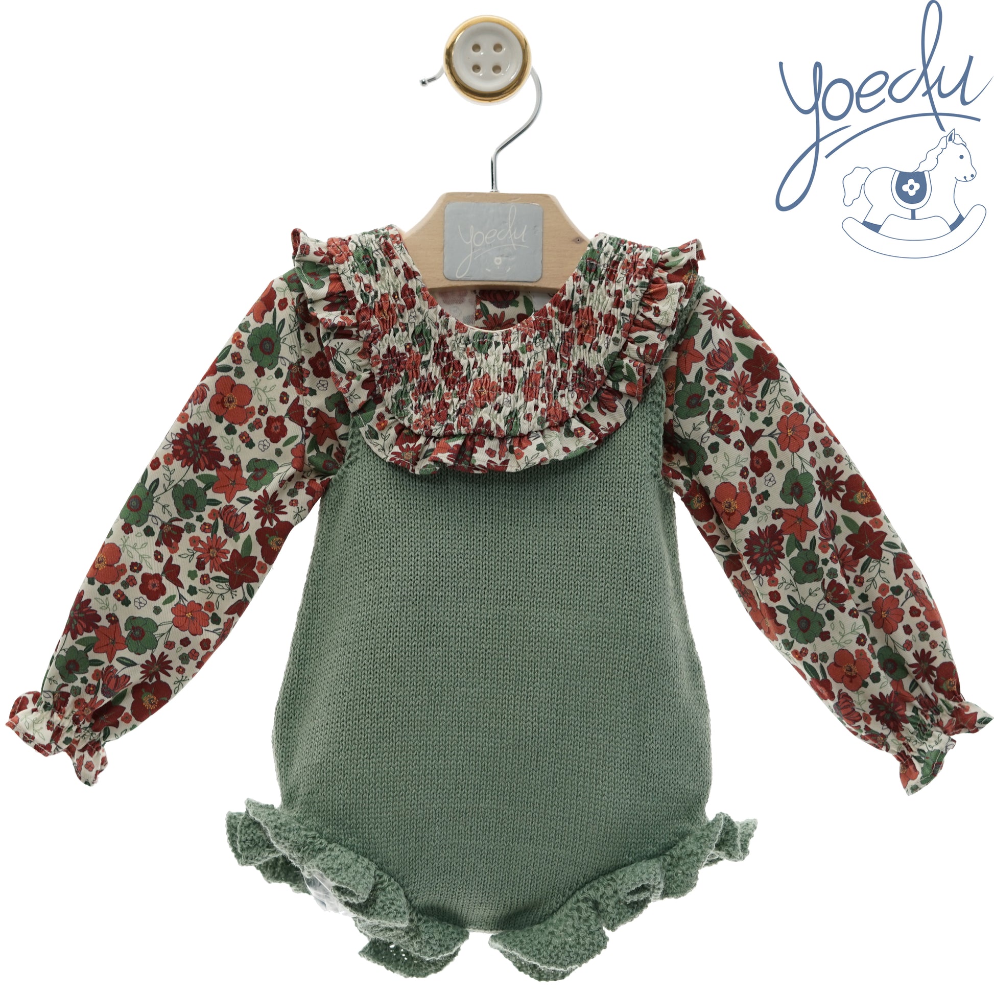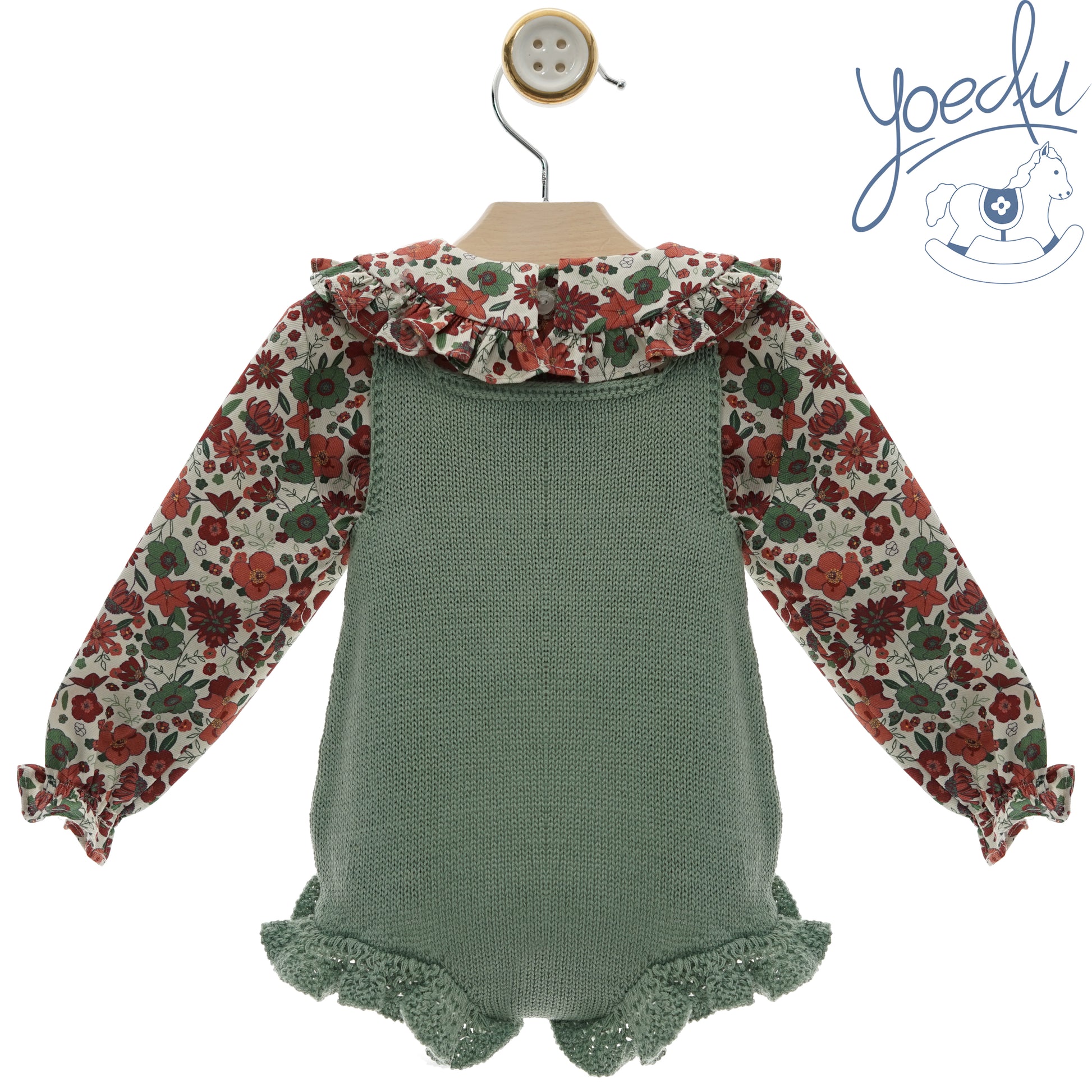 Encantador conjunto composto por fofo em malha verde com detalhes em folhos e blusa de manga comprida em estampado floral vermelho e verde. A gola em folho combina na perfeição com as mangas, criando um visual clássico e acolhedor, ideal para os dias de outono e inverno.