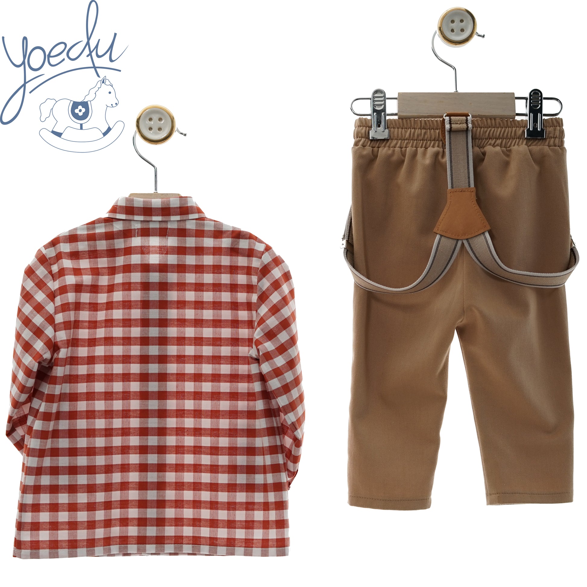 Conjunto de menino composto por camisa de manga comprida em padrão xadrez vermelho e branco, combinada com calças camel de corte clássico e alças ajustáveis em tom bege. Um look elegante e confortável, perfeito para cerimónias, festas ou ocasiões especiais.