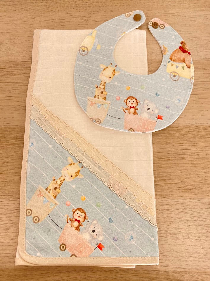 Delicado e prático, este conjunto é composto por uma fraldinha em tecido suave com detalhe rendado , acompanhada por um babete coordenado no mesmo padrão. Um toque clássico e romântico para os momentos do bebé, ideal para oferecer ou complementar o enxoval.