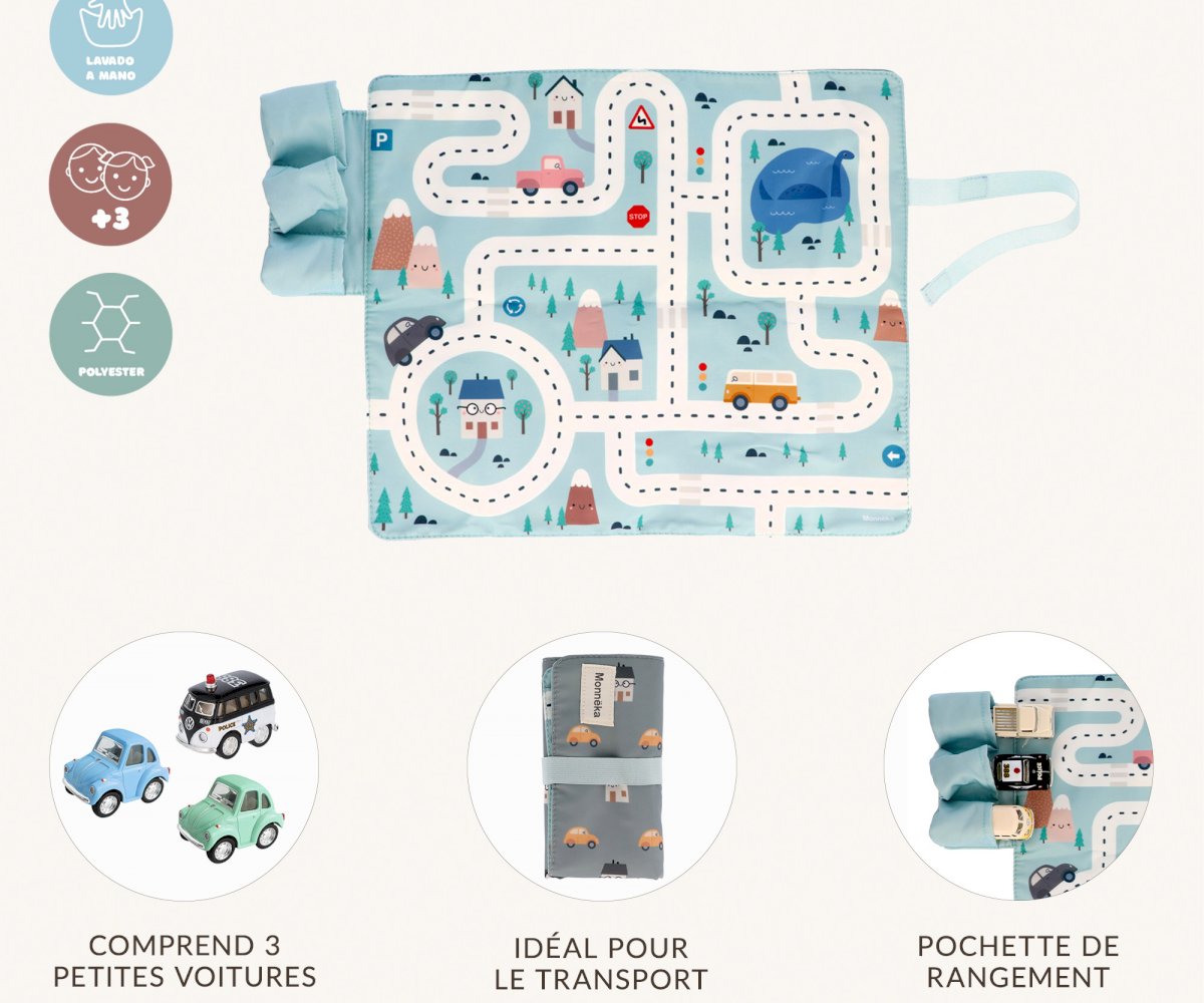 Individual mesa com o desenho de um circuito para que você possa brincar com autos ou até mesmo carregá-la na bolsa quando sair para comer fora de casa ou em uma viagem e manter seu filho entretido.