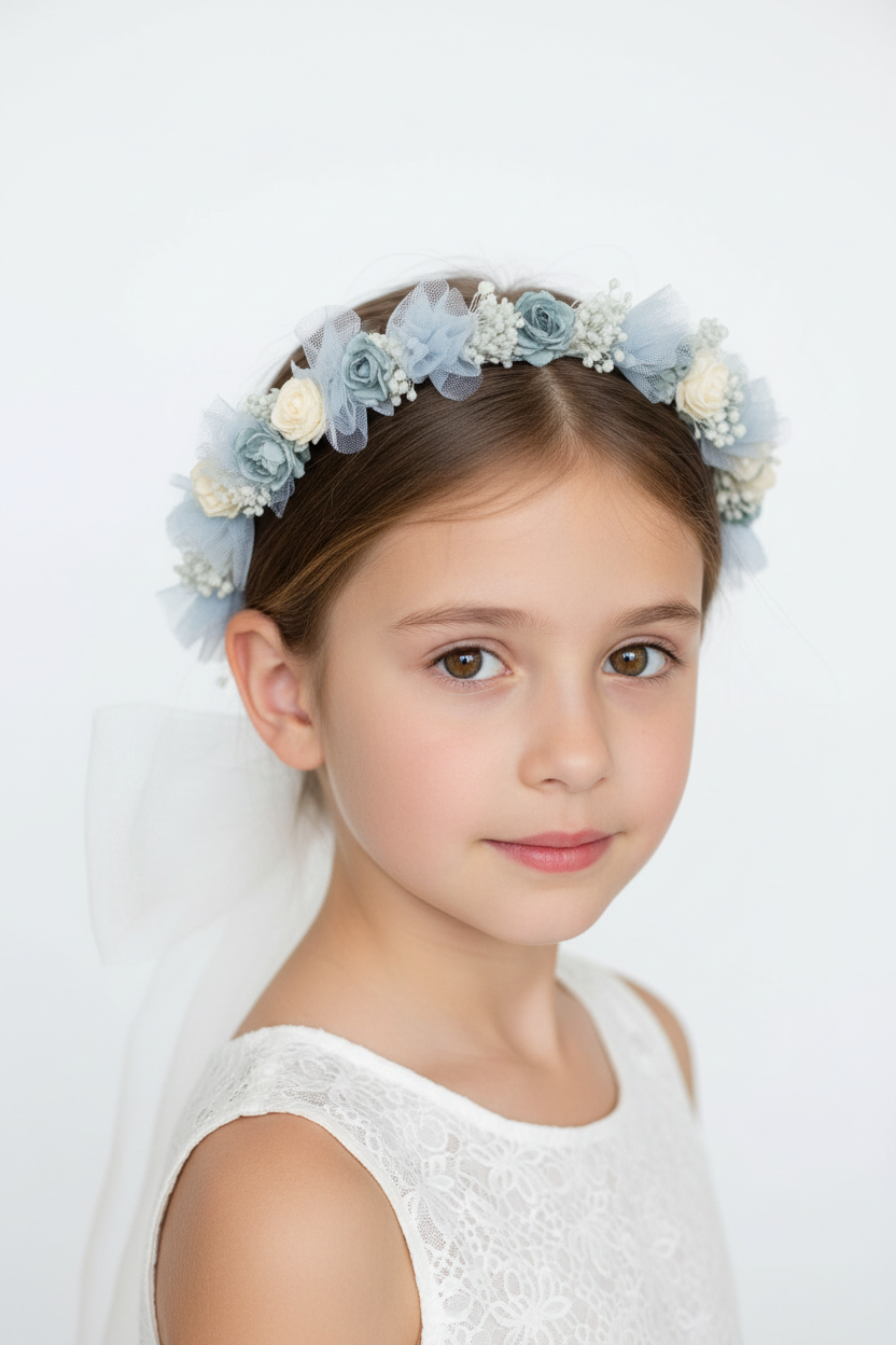 Esta coroa infantil revela uma estética etérea e romântica, pensada para momentos verdadeiramente especiais. Composta por flores têxteis delicadas em tons azul suave, combinadas com tule leve e apontamentos florais minuciosos, cria uma harmonia visual cheia de leveza. O acabamento artesanal confere um charme subtil e elegante, enquanto a estrutura flexível garante conforto ao longo do dia. Uma peça que transmite pureza, serenidade e encanto, respeitando a suavidade natural da infância.