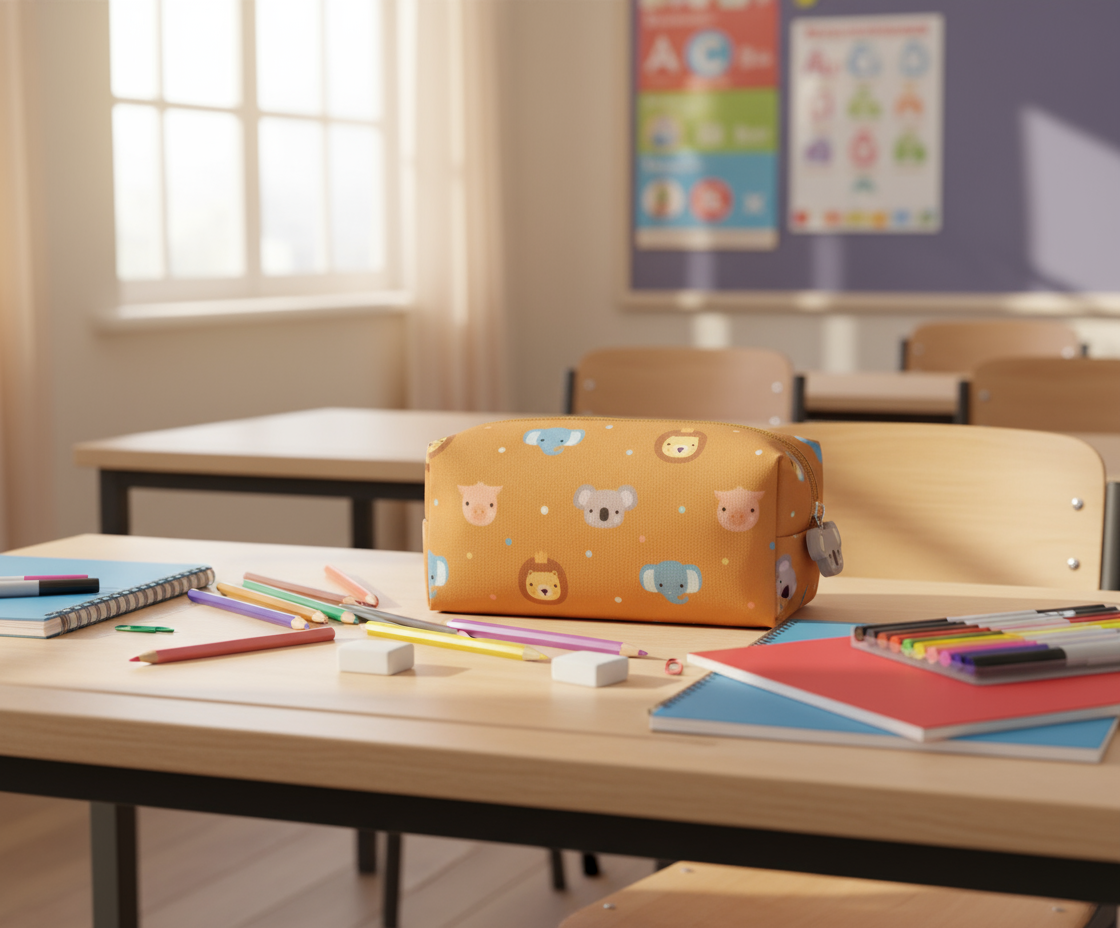 O estojo escolar Animal Friends é aquele amigo que nunca abandona a mochila. Em tons quentes de mostarda, traz um padrão encantador de leões, elefantes, koalas e porquinhos, com expressões doces que conquistam miúdos e graúdos. Fabricado em tecido resistente e leve, protege lápis, canetas e marcadores do dia a dia escolar. O fecho de correr, com pendente em forma de koala, desliza suavemente e acrescenta um detalhe divertido e carinhoso.