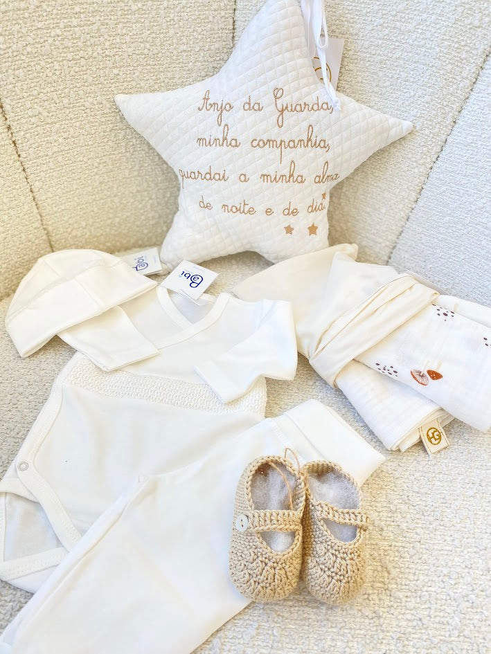 Feita à mão no Atelier HG, em tecido de qualidade e com bordado delicado da quadra do Anjo da Guarda, esta estrela é pensada para envolver a criança num ambiente de paz e ternura.