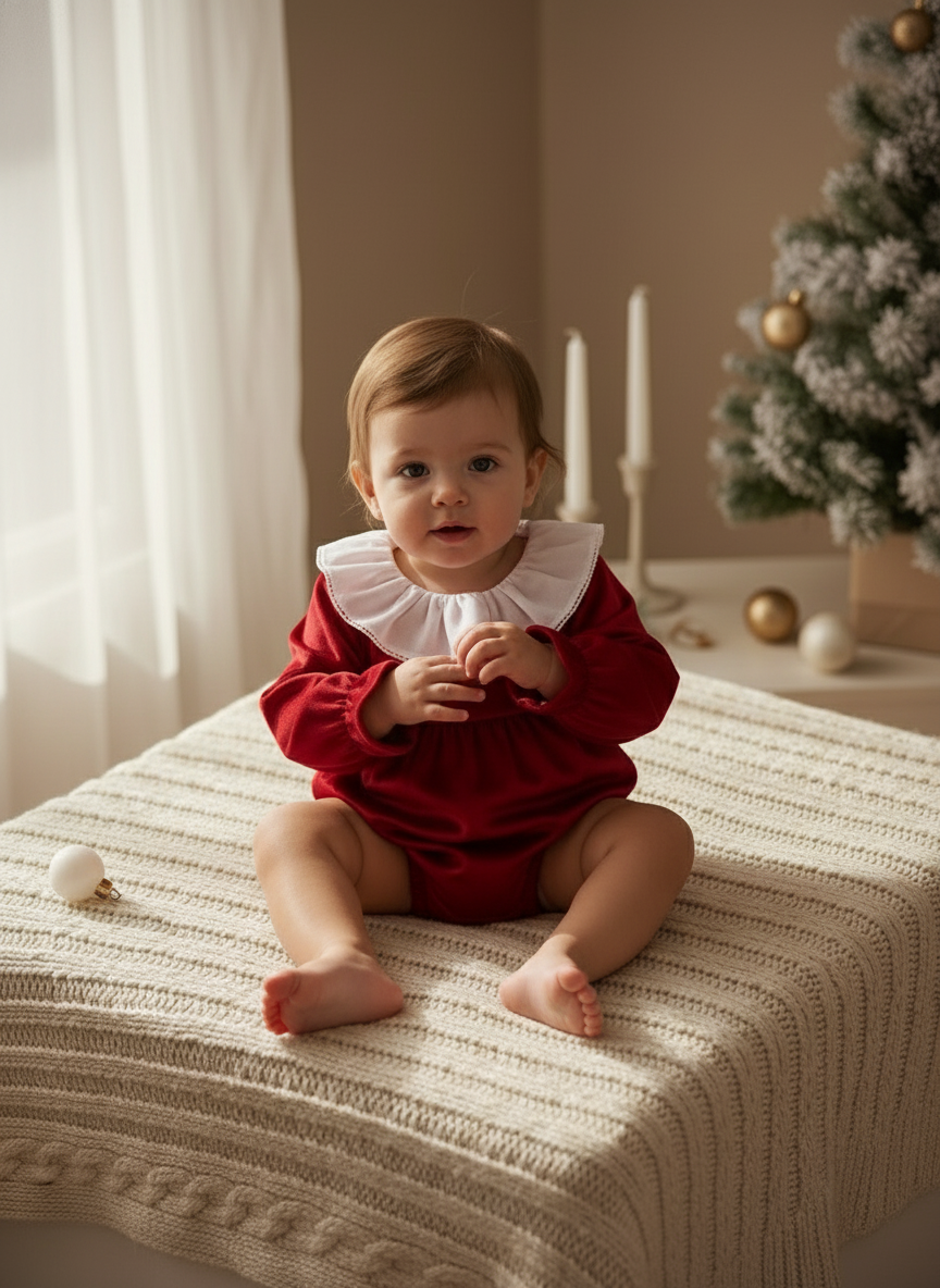 Confeccionado em veludo vermelho suave, este fofo envolve o bebé com um toque macio e aconchegante, perfeito para pele delicada. A gola branca em tecido leve, delicadamente franzida, acrescenta um ar clássico e luminoso ao coordenado. As mangas compridas com punho elástico e a zona das pernas franzida garantem liberdade de movimentos, mantendo sempre um cair elegante. O fecho inferior com molas e botão decorativo facilita a muda, sem perder a harmonia do modelo.