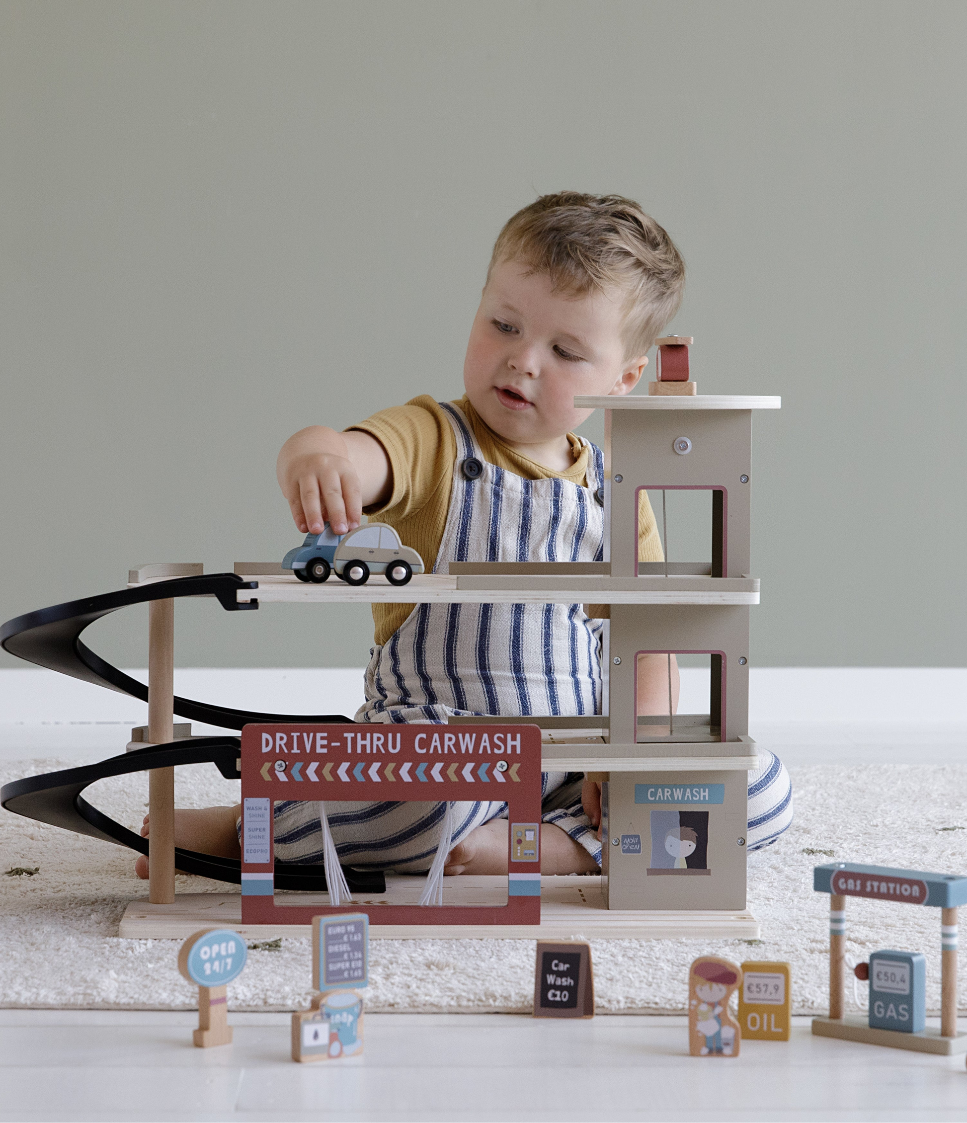 Parem na garagem para abastecer, estacionar ou mandar lavar no lava-rápido. Esta garagem de madeira é um dos muitos conjuntos que podem ser ligados à ferrovia Little Dutch para expandir a diversão!