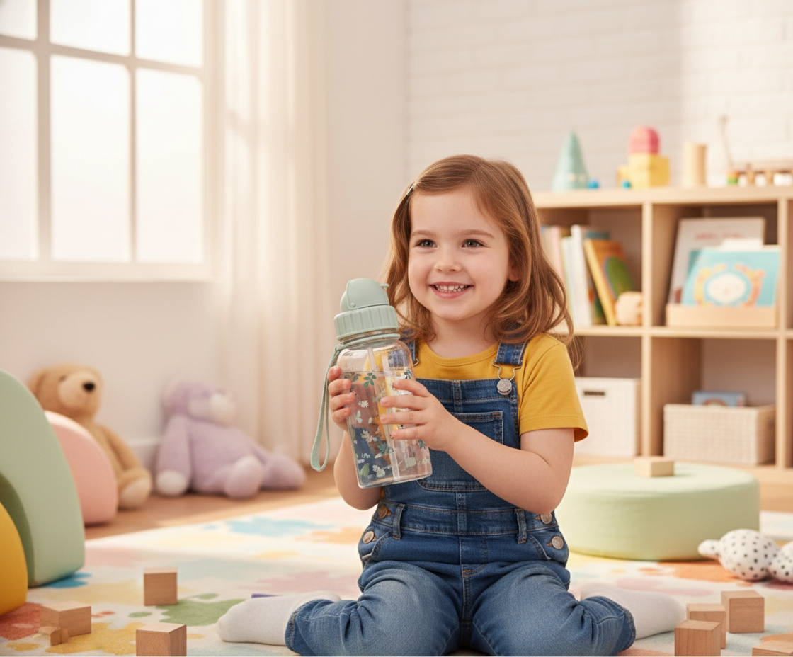 A garrafa de plástico Leaves Sage combina delicadeza e funcionalidade num só gesto. Transparente, com tampa em verde sálvia suave e um padrão elegante de folhas em tons verdes, traz a serenidade da natureza para o dia a dia dos mais pequenos. Produzida em plástico resistente tipo Tritan, é leve, duradoura e livre de BPA, oferecendo toda a segurança na hora de beber. A tampa basculante protege a palhinha incorporada, evitando derrames, e a fita lateral permite transportá-la com facilidade na mão ou pendurada na mochila.