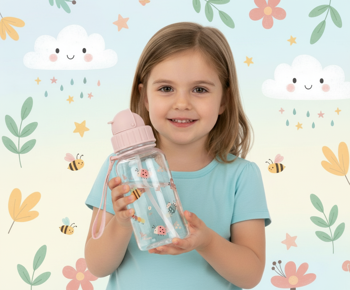 A garrafa de plástico Bugs transforma a hidratação numa brincadeira doce e colorida. Transparente, com tampa rosa suave e padrão encantador de joaninhas, abelhas, borboletas e outros bichinhos, convida as crianças a beber água com prazer. Fabricada em plástico resistente tipo Tritan, é leve, duradoura e livre de BPA, oferecendo toda a segurança. A tampa basculante protege a palhinha incorporada, evitando salpicos, enquanto a fita lateral facilita o transporte na mão ou pendurada na mochila.