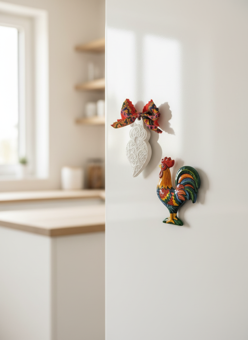 Inclui íman na parte posterior, permitindo decorar portas, frigoríficos ou painéis metálicos. Coração em gesso perfumado de cor branca, com laço em tecido colorido de inspiração minhota. Apresentado individualmente em caixa rígida com enchimento natural, ideal para oferecer.