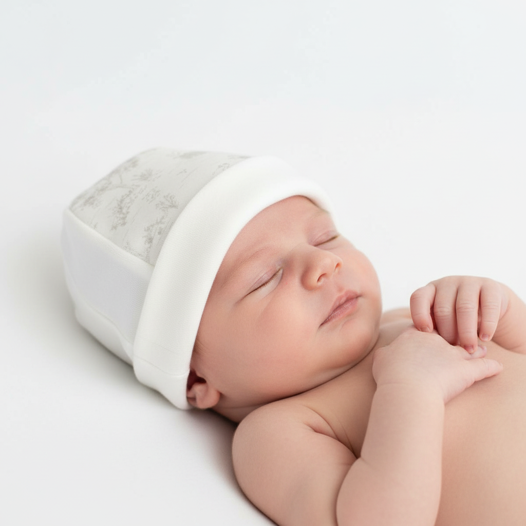 Indicado para recém-nascido. Tom branco suave com padrão campestre discreto no interior. Ajuste confortável com dobra inferior para melhor adaptação.