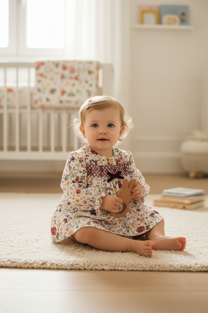 O Jesusin “Família Greta” traduz a delicadeza da infância num design cheio de ternura e tradição. Confeccionado em tecido floral suave, destaca-se pelo smock bordado delicadamente no peito, enriquecido por um laço em veludo que acrescenta elegância subtil. O corte amplo garante liberdade de movimentos e conforto absoluto, enquanto as mangas compridas com acabamento delicado protegem a pele sensível do bebé com suavidade e carinho.