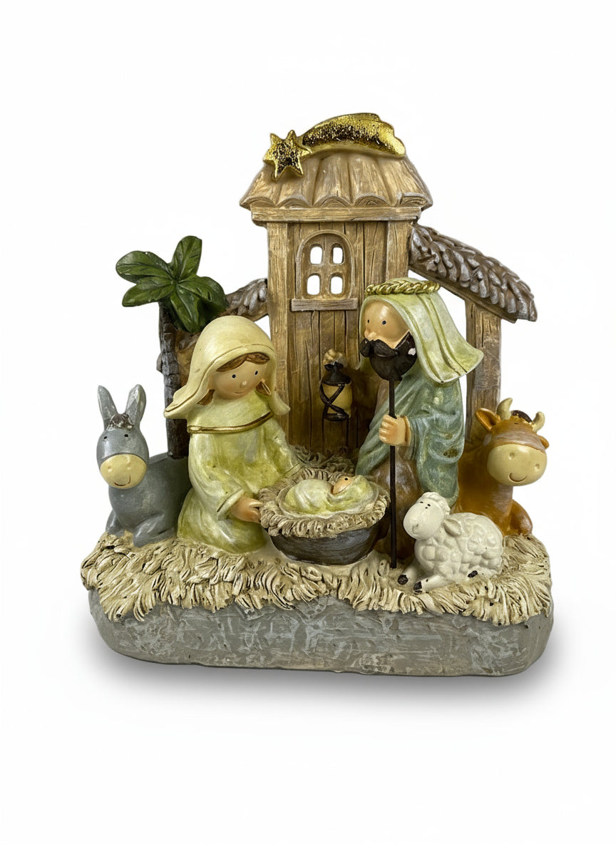 Este encantador presépio em poliresina traduz toda a ternura e simplicidade da noite de Natal. Com figuras de traços suaves e expressões delicadas, Maria, José e o Menino Jesus partilham o centro da cena, rodeados pelo burrinho, a ovelha e o boi, sob a estrela dourada que ilumina o estábulo. Os tons naturais e os detalhes pintados à mão criam uma atmosfera acolhedora e espiritual, perfeita para celebrar a fé e a pureza deste momento sagrado.