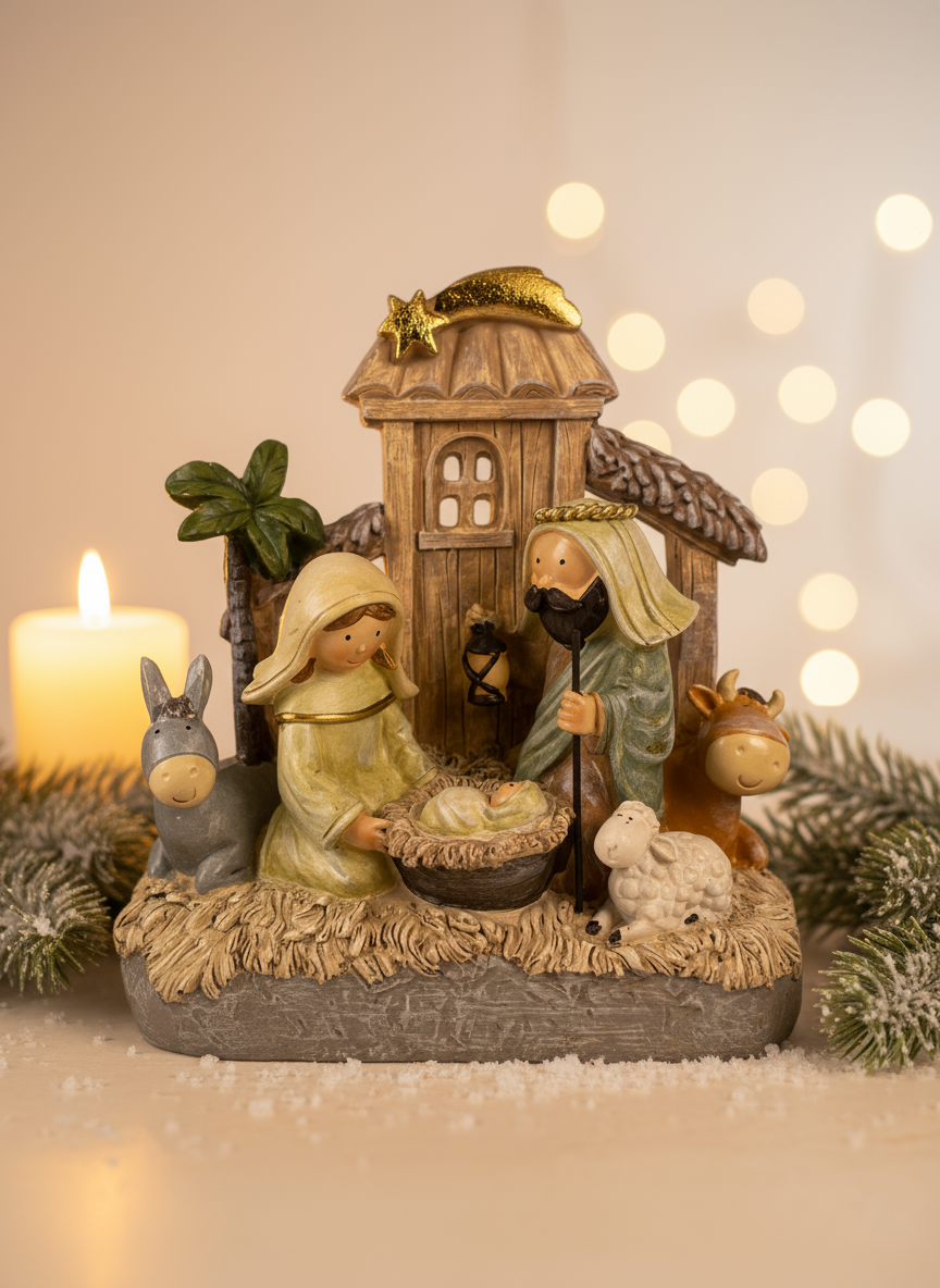 Um presépio encantado que guarda no coração a luz e a ternura do nascimento de Jesus.