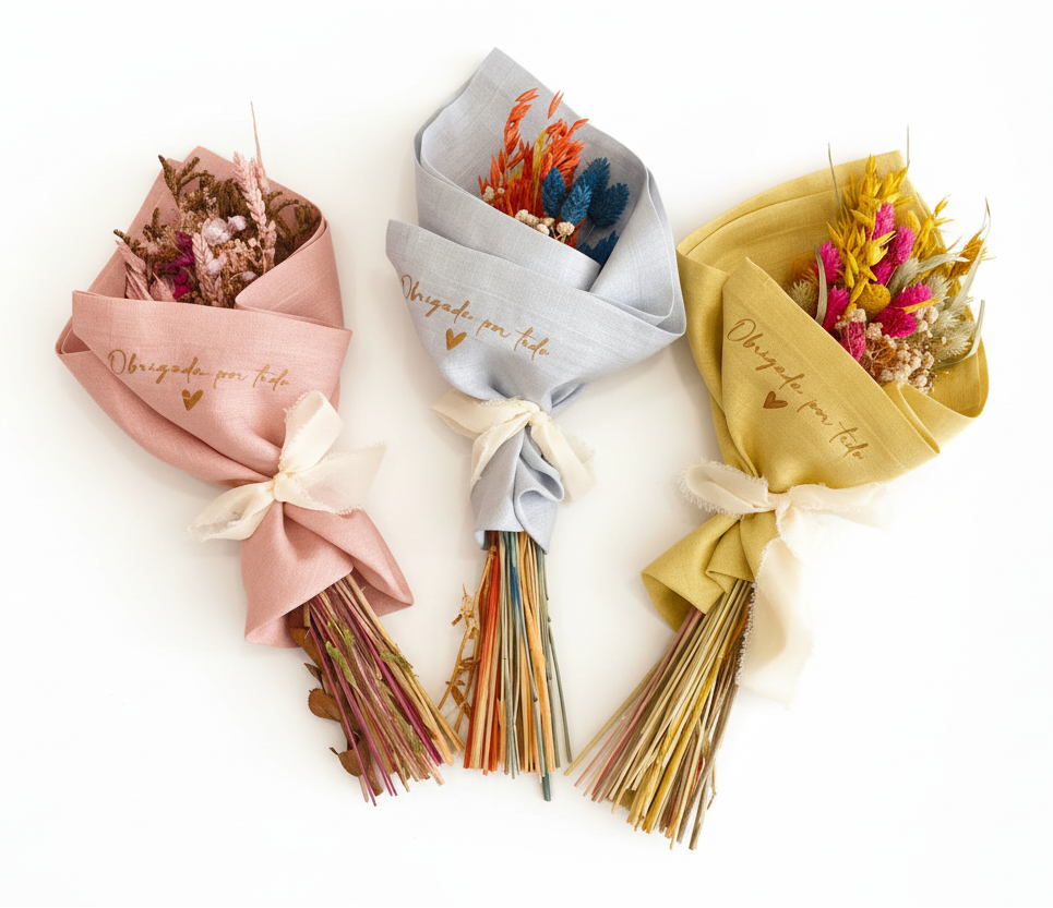 Um ramo que diz “obrigada por tudo” com beleza que duraO Ramo em Flores Preservadas do Atelier HG foi criado para transformar gratidão em presente, com um encanto delicado e intemporal. Com flores preservadas de longa duração, mantém a beleza por muito mais tempo, sem perder a suavidade dos tons e a elegância do conjunto. Cada ramo é cuidadosamente embrulhado em linho, com mensagens bordadas que tocam o coração — como “Obrigada por tudo” ou “Gratidão”. Um gesto simples, cheio de significado e cuidado artesanal. Disponível em tons suaves: rosa, azul céu e amarelo. Embalagem em linho com laço e mensagem bordada. Possibilidade de bordado personalizado (sob consulta). Flores preservadas com duração prolongada.