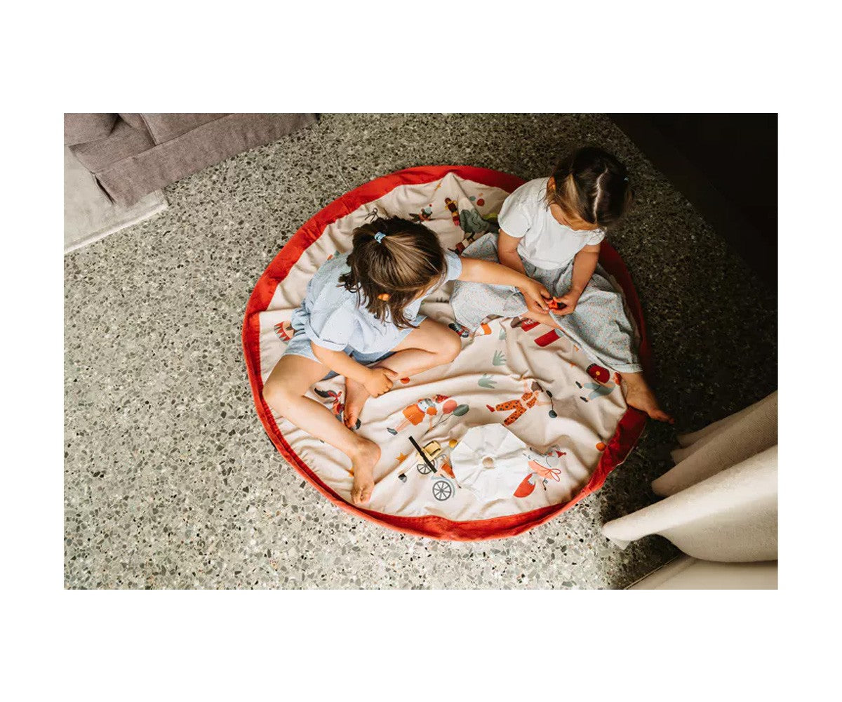 O saco se desdobra e se torna uma manta de brincar onde a criança pode brincar com todos os seus brinquedos, grandes e pequenos, e na hora de ir para a cama, basta fechá-la e tudo está recolhido.