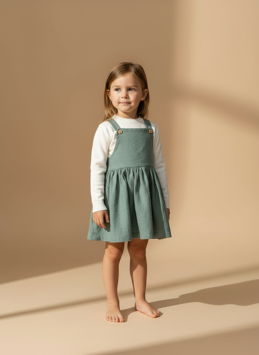 Feita em bombazine suave e respirável, esta saia de peito verde seco combina elegância clássica com conforto natural. O seu corte fluido, de inspiração tradicional, cria um movimento leve e gracioso a cada passo. As alças cruzadas com botões em madeira adicionam um toque rústico e encantador, enquanto o tom verde seco transmite serenidade e delicadeza. Uma peça pensada para acompanhar os momentos mais doces da infância, com a qualidade e o encanto característicos do Atelier Hábitos de Geração.