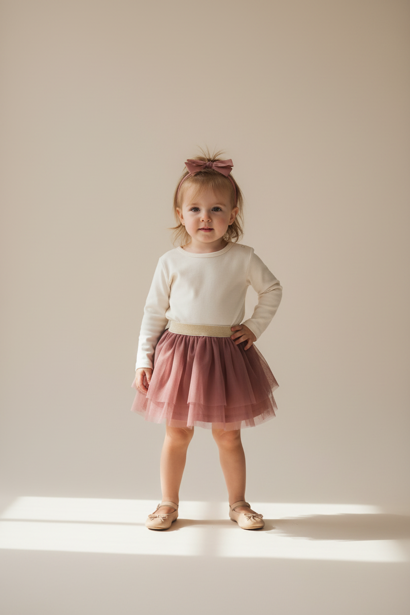 A Saia Rosa Velho é uma peça encantadora que combina tule suave em camadas com um cintura elástica confortável, criando um visual leve e cheio de movimento. O tom rosa velho transmite delicadeza e sofisticação, enquanto a transparência subtil do tule acrescenta um toque etéreo e elegante. Pensada para acompanhar cada passo com conforto, adapta-se ao corpo com suavidade, permitindo liberdade total nos gestos mais espontâneos da infância.
