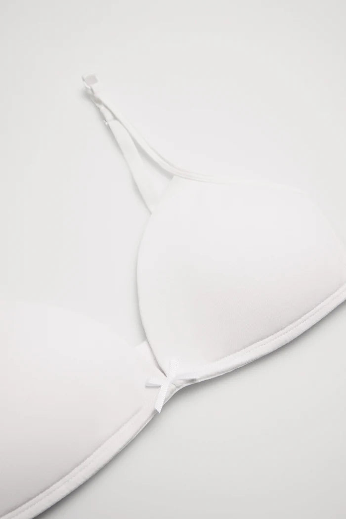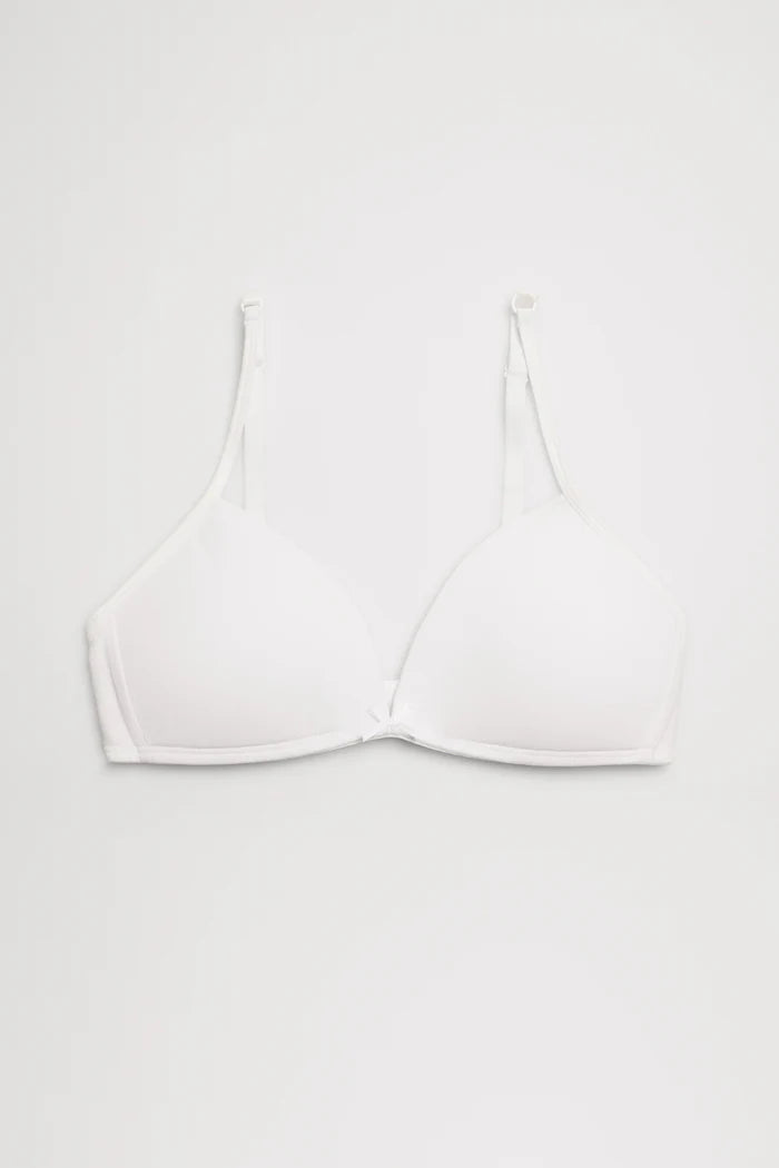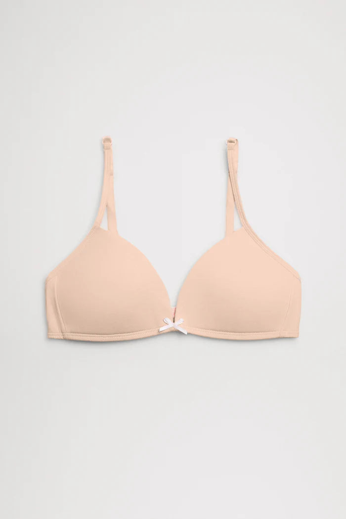 Soutien juvenil em forma de triângulo, em algodão, com ligeiro enchimento e alças finas e ajustáveis. O fecho tem três fivelas para ajustar ao tamanho correto. Se está à procura do seu primeiro sutiã, este é o ideal para si.