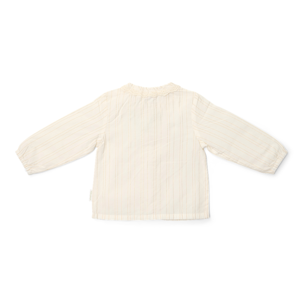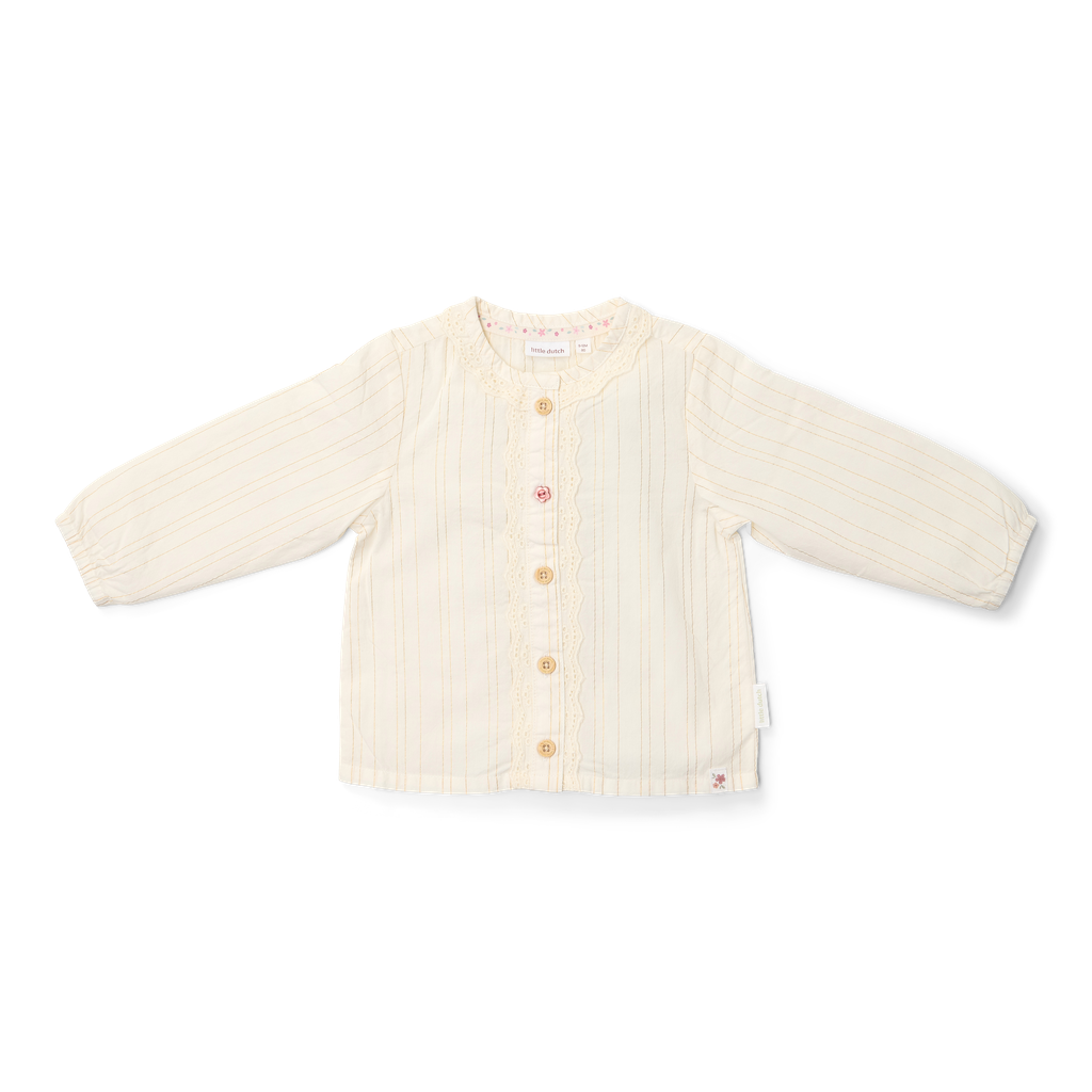 Uma peça leve e delicada em tom creme com finas riscas douradas, perfeita para compor looks elegantes e confortáveis. O detalhe em renda ao longo da carcela e os botões frontais em tons suaves dão-lhe um charme especial, tornando-a única e amorosa.