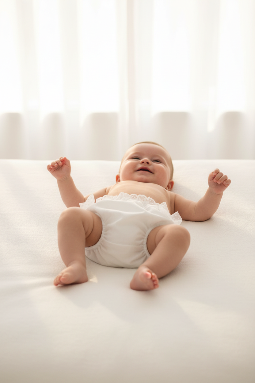 Este tapa-fraldas distingue-se pela sua elegância intemporal e pelo cuidado artesanal dos acabamentos. Confeccionado em tecido leve, macio e respirável, proporciona conforto absoluto ao longo do dia, respeitando a pele delicada do bebé. A renda suave e discreta acrescenta um toque romântico e refinado, elevando a simplicidade do design clássico. A cintura elástica garante um ajuste confortável, acompanhando cada movimento com naturalidade e segurança.