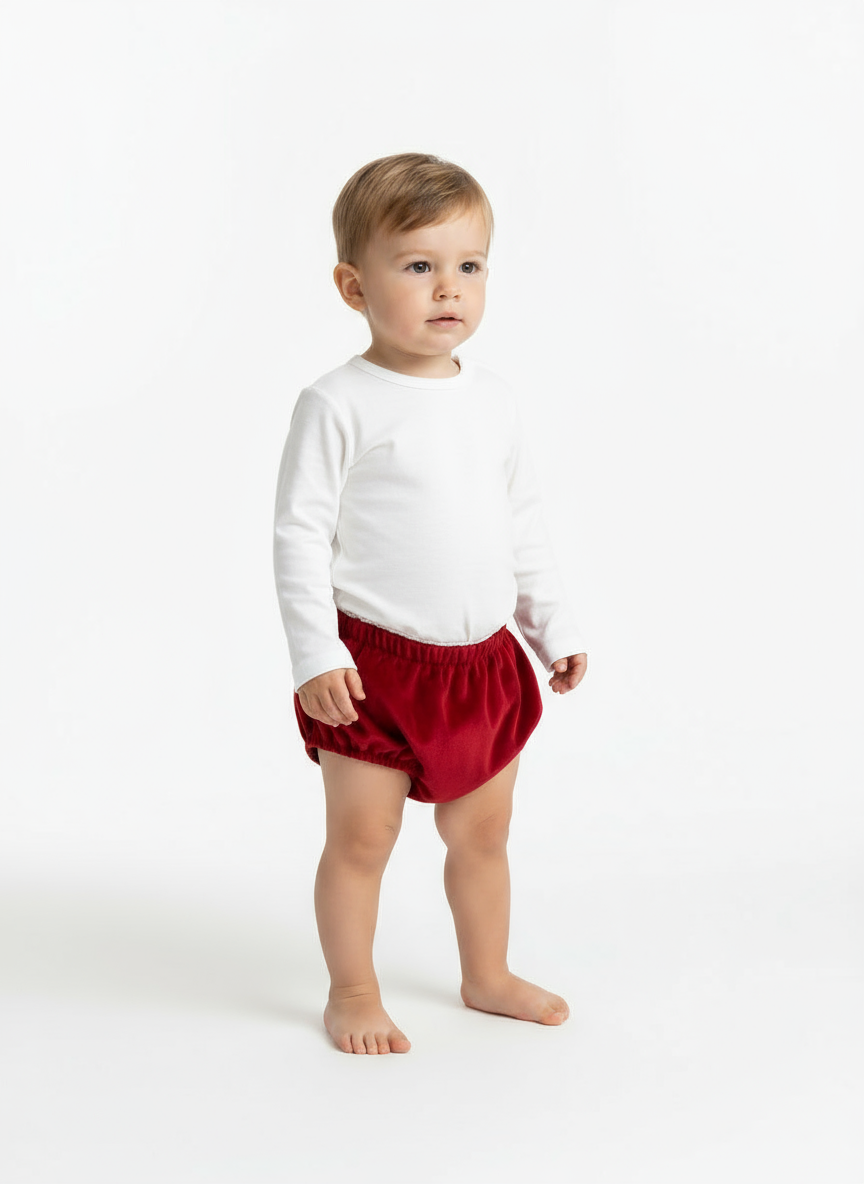 O tapa-fraldas duplo em veludo vermelho/xadrez é uma peça irresistível que combina elegância e conforto em partes iguais. Confeccionado em veludo macio e quente, com forro interior em tecido xadrez, oferece um toque aconchegante e cheio de estilo. O design clássico com cós e perninhas elásticas garante um ajuste perfeito, enquanto o contraste subtil entre o veludo e o padrão interior revela o cuidado artesanal que distingue o Atelier Hábitos de Geração.