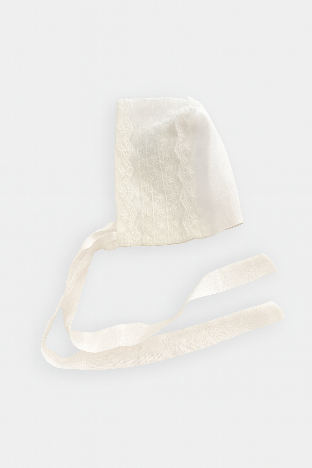 Delicada e atemporal, esta touca em linho branco é ideal para completar o coordenado de batizado. Confeccionada em tecido leve e respirável, apresenta um elegante detalhe de bordados florais na parte frontal e acabamento com renda suave, conferindo um charme especial e tradicional.