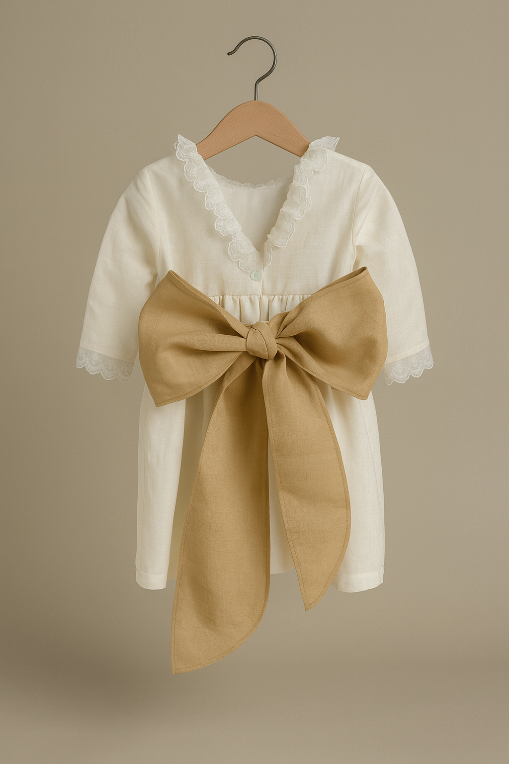 Confeccionado em linho de alta qualidade, o Vestido Pérola encanta pela sua simplicidade elegante e pelo tom marfim suave, símbolo de pureza e serenidade. O design clássico é realçado por rendados delicados no decote e nas mangas, e uma faixa de cintura com laço nas costas acrescenta um toque de charme intemporal. O seu corte fluido e confortável envolve o corpo com leveza, permitindo que cada movimento seja natural e gracioso — perfeito para momentos que ficam guardados no coração.